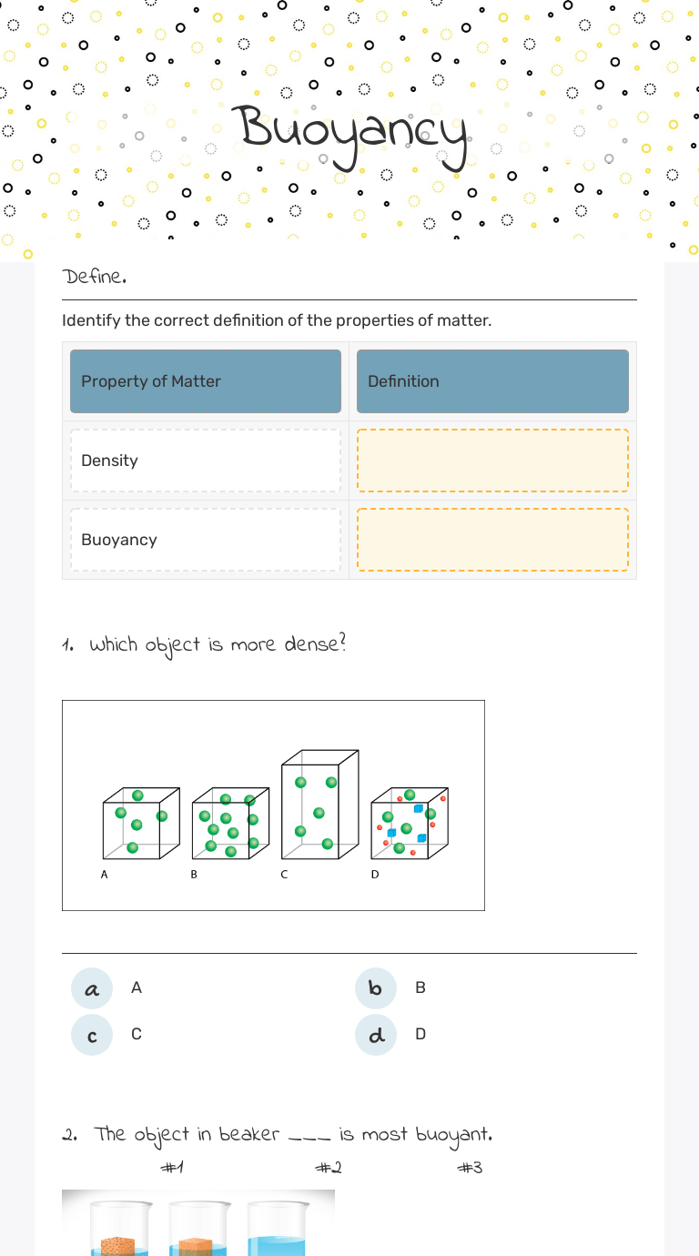 That covered the concepts of flow rate, density and buoyancy. These printables explore this basic scientific . Complete the following chart for the objects placed in water: Students are challenged to use their understanding of buoyancy, density,. Begin the class by asking students for their definition of buoyancy.